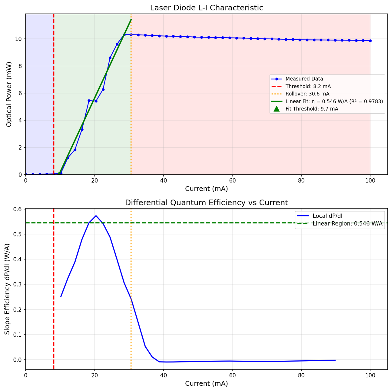 Thermal rollover (>30 mA): Power saturates/decreases due to heating