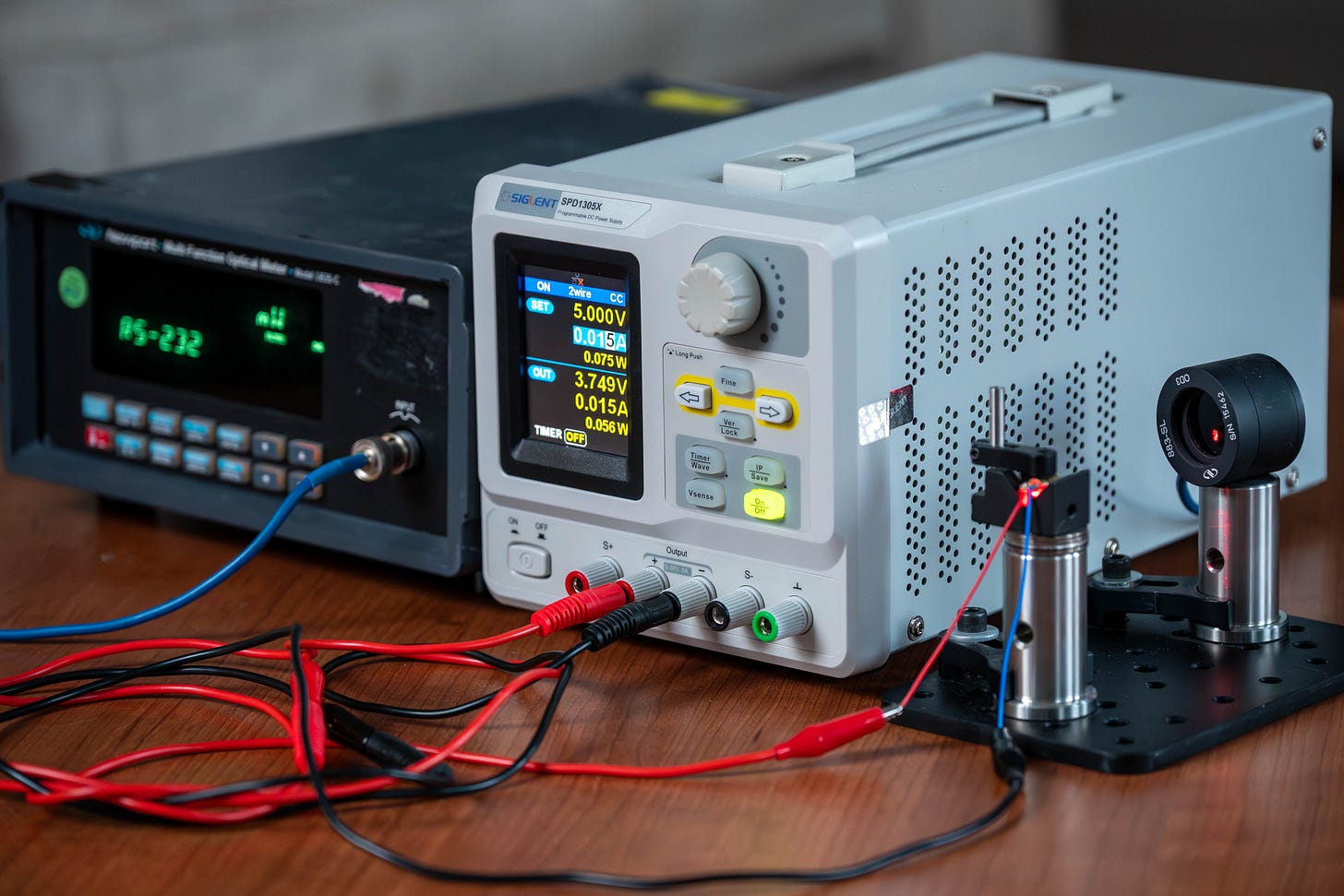 I bought an electronic power supply (Siglent SPD1305x) and connected it to a 650 nm laser diode I purchased from Amazon. I don’t know anything about these diodes, and they don’t come with a data sheet. That’s what you get when you buy a 10 pack for $7. I pointed the diode output into an optical power meter (Newport 818-SL connected to a Newport 1835-C). As far as the hardware goes, about as simple as it gets. The power supply and power meter both connect to my computer via USB, with the power meter using a RS232 serial-to-USB adapter.